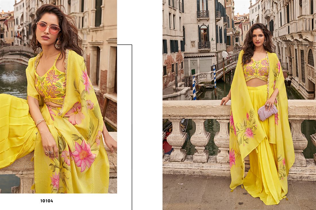 Get ready to rock the party with our Melodi Chinon Western Wear outfit! Crafted from premium real Chinon silk/viscose jacquard silk, this ensemble includes a front and back embroidered shrug paired with an embroidered blouse featuring hand-embellished mirror work. The free size stitched plazzo ensures a perfect fit for every body type. Step up your festive look with this chic and fashionable outfit that combines style and comfort seamlessly.