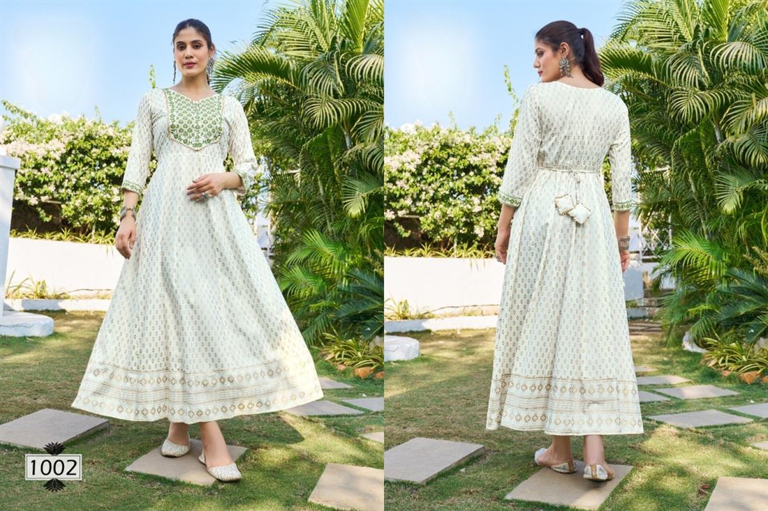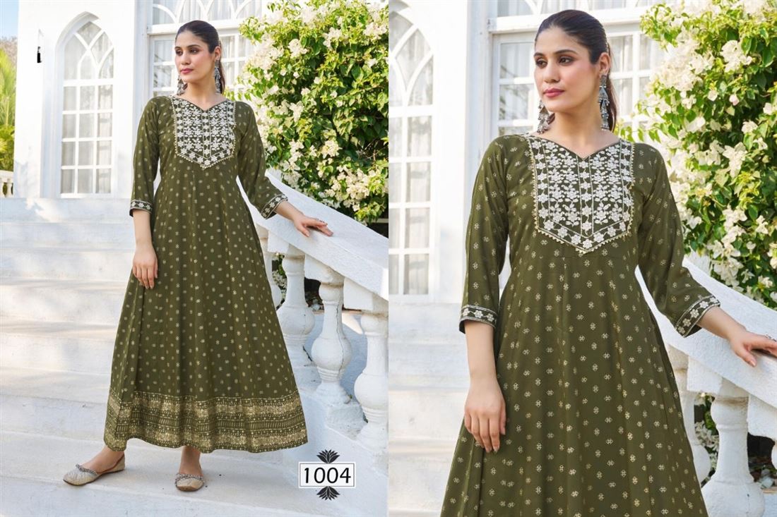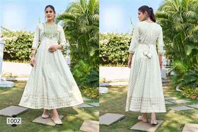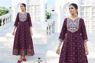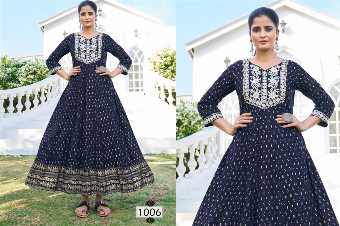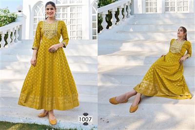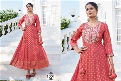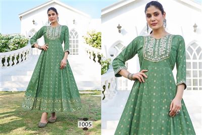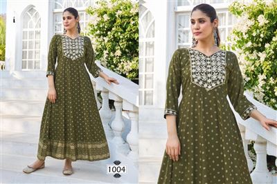 | Fabric | Rayon 14 Kgs Foil Print Anarkali Gown With Neck Embroidery |