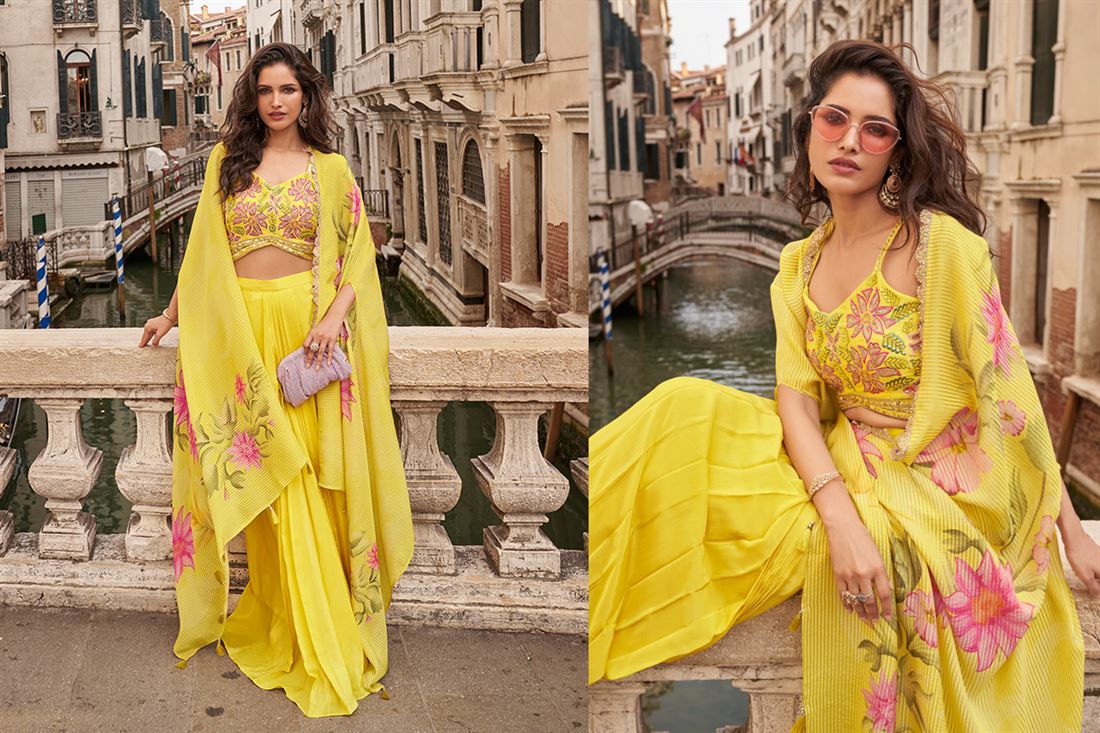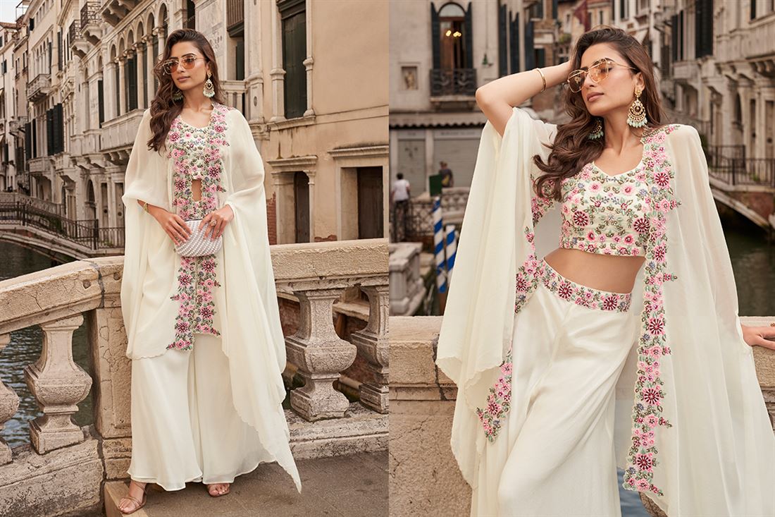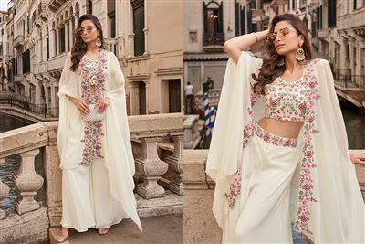 | Fabric | PREMIUM REAL CHINON SILK / VISCOSE JACQUARD SILK ( TRENDY FESTIVE LOOK FRONT AND BACK EMBROIDERED SHRUG WITH EMBROIDERED BLOUSE ON HAND EMBELLISHED MIRROR WORK WITH STYLIST PLAZZO ) |