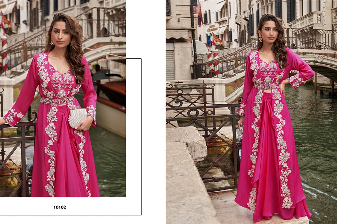 Get ready to rock the party with our Melodi Chinon Western Wear outfit! Crafted from premium real Chinon silk/viscose jacquard silk, this ensemble includes a front and back embroidered shrug paired with an embroidered blouse featuring hand-embellished mirror work. The free size stitched plazzo ensures a perfect fit for every body type. Step up your festive look with this chic and fashionable outfit that combines style and comfort seamlessly.