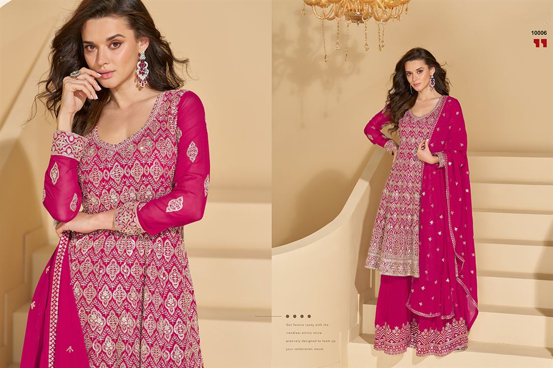 | Fabric | TOP/BOTTOM/DUPATTA :- REAL PREMIUM GEORGETTE ( FULL HEAVY LOOK EMBROIDERED TOP WITH EMBROIDERED PALAZZO AND DUPATTA ) |